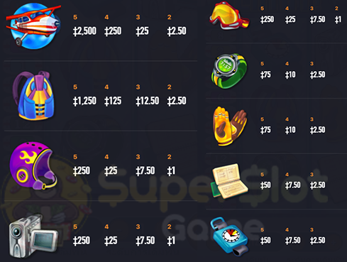 - ทดลองเล่นสล็อตฟรี สัญลักษณ์รูปเครื่องบิน เมื่อปรากฏตรงกัน 2-5 สัญลักษณ์ในไลน์การจ่าย จะได้รับเงินรางวัล 0.25 บาท, 2.50 บาท, 25 บาท และ 250 บาท