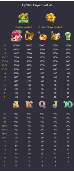 - เมื่อสิ้นสุดการหมุน สัญลักษณ์ Lucky Clover แต่ละตัว (ถ้ามี) จะแสดงสัญลักษณ์เพิ่มเลเวลหรือสัญลักษณ์ตัวคูณที่มีค่า x2 ถึง x20