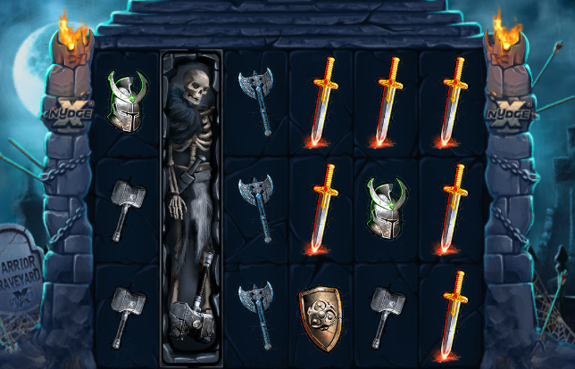 Warrior Graveyard มีสัญลักษณ์การจ่ายเงิน 10 แบบให้ใช้งาน ไอคอนตำแหน่งเดียวแบบจ่ายต่ำ 5 แบบ และพรีเมี่ยมรีล 5 อัน ที่ด้านล่าง เราพบค้อน ขวาน หมวก โล่ และดาบ มีมูลค่าสูงถึง 3 เท่าของเงินเดิมพันสำหรับหก ถัดไปคือศพที่น่าสยดสยองห้าศพที่ฝังอยู่ในอุปกรณ์ต่อสู้ของพวกเขาในโทนสีดำ น้ำเงิน เขียว น้ำตาล และแดง ซึ่งมีมูลค่า 3.3x ถึง 6x ของการเดิมพันสำหรับหกชนิด