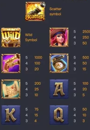 - สัญลักษณ์ โจรสลัดสาว อัตราการจ่ายรางวัล อยู่ที่ 3 ตัว จ่าย 50, 4 ตัว จ่าย 250 และ 5 ตัว จ่าย 2,500 ตามลำดับ