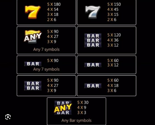 สัญลักษณ์อัตราการจ่ายเงินรางวัลของเกมนี้ใน sca68-th มีอยู่มากมายหลายอย่าง ที่มาพร้อมอัตราการจ่ายที่แตกต่างกัน ไม่ว่าจะเป็น เลข 7 สีทอง เลข 7 สีเงิน เลข 7 Any Bar 3 อัน Bar 2 อัน Bar 1 อัน และ Bar any เรียงจากซ้ายไปขวาเสมอ ต้องมีสัญลักษณ์เหมือนกันอย่างน้อย 3 ตัว สูงสุดถึง 5 ตัว การหมุน 1 ครั้งสามารถชนะได้มากกว่า 1 ไลน์เดิมพันหากเกิดข้อผิดพลาดระหว่างเกมจะถือว่าเป็นโมฆะทั้งหมด