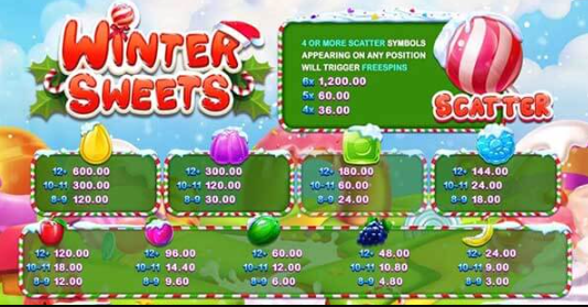 ภายในเกมนี้จะมีภาพสัญลักษณ์ต่างๆจำนวนมาก ปรากฏขึ้นมา ซึ่งนักพนันทุกท่านทุกท่านสามารถเข้ามาศึกษารายละเอียดอัตราการจ่ายเงินเกมสล็อตวินเทอร์สวีตได้ข้างล่างนี้ โดยในการเล่นเกม Winter Sweets จะประกอบไปด้วย ภาพสัญลักษณ์ลูกอมสีเหลือง, ภาพสัญลักษณ์ลูกอมสีม่วง, ภาพสัญลักษณ์ลูกอมสีเขียว, ภาพสัญลักษณ์ลูกอมสีฟ้า, ภาพสัญลักษณ์แอปเปิล, ภาพสัญลักษณ์ลูกท้อ, ภาพสัญลักษณ์แตงโม, ภาพสัญลักษณ์องุ่น และ ภาพสัญลักษณ์กล้วย เป็นต้น sca68-th