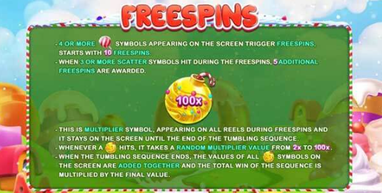ภาพสัญลักษณ์ลูกอมสีเขียว มีอัตราการจ่ายเงินอยู่ที่ 12+ ภาพ = 180, 10-11 ภาพ = 60, 8-9 ภาพ = 24
