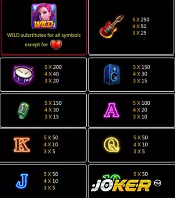 - สัญลักษณ์ กีต้าร์ อัตราการจ่ายเงินรางวัลของเกม อยู่ที่ 5x = 250 , 4x = 50 , 3x = 25 ตามลำดับ