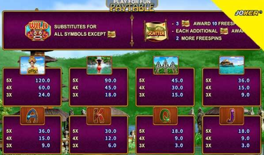 เกมสล็อต นี้แต้มที่ได้มากสุดในเกมนั่นคือ รูปสาวงามบาหลี ซึ่งมีผลคูณถึง 120 และน้อยสุดคือ 3 คะแนน ซึ่งการหมุนสปิน 1 ครั้งนั่นคุณจะมีโอกาสชนะมากกว่า 1 ไลน์ หมายถึงก็จะได้รางวัลจากหลายทางมากขึ้น ซึ่งอัตราการจ่ายเงินรางวัลก็จะเพิ่มมากขึ้น โดยอัตรารางวัลนั้นจะมาขึ้นหรือน้อยลง ผู้เล่นสามารถปรับเพิ่มอัตราการเดิมพันได้ตามใจชอบ