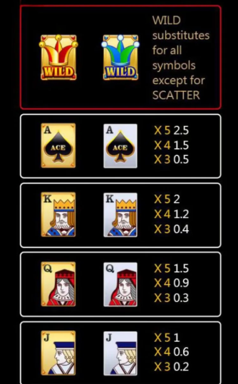 - สัญลักษณ์ต่างๆ เช่น ไพ่ A ไพ่ K ไพ่ Q ไพ่ J ไพ่ 10 และอื่นๆ