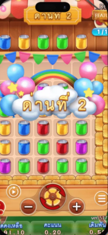 ด่านที่ 2 ข้อจำกัดของด่านต่อมาเป็นสัญลักษณ์ทั่วๆไปจะเป็นรูปกระป๋องน้ำหวาน 5 สี จะเป็นรูปแบบที่ถูกเปิดมากขึ้นมาเป็น 5 รีล 5 แถว ถ้าผู้เล่นได้สีเดียวกันและเรียงชิดกันตั้งแต่ 5 ภาพขึ้นไป จะได้รับรางวัลโดยสามารถได้รับสัญลักษณ์กระป๋องสูงสุดในขณะเดียวกันครั้งละ 15-25 ช่อง ในระหว่างการเล่นด่านที่ 2 ผู้เล่นจำเป็นต้องสะสมสัญลักษณ์ค้อนของเล่นเพิ่มเติม 15 ชิ้น ก็เลยจะสามารถผ่านไปด่านต่อไปได้