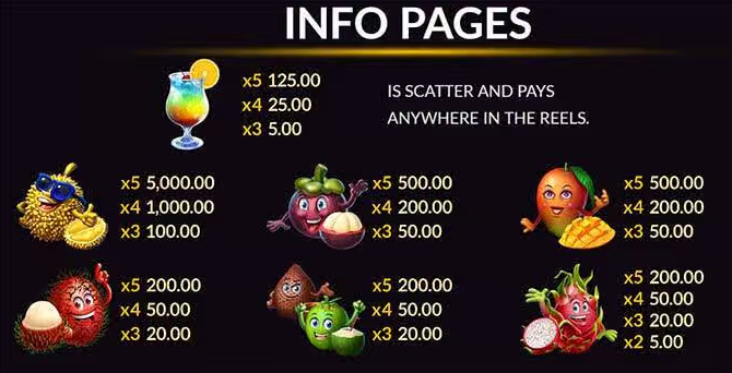 Fruit Paradise เป็นแบบสล็อต 5 รีล 3 แถว รูปแบบของการชนะเงินรางวัลได้ทั้งหมดได้สูงมากๆ สูงสุดได้ถึง 40 รูปแบบ โดยที่สัญลักษณ์ในเกม มีอยู่ด้วยกันทั้งหมด 8 อย่างด้วยกัน แม้จะน้อยแต่ก็จะทำให้จำได้ง่าย คำนวณการจ่ายรางวัลได้แม่นยำมากขึ้น ประกอบไปด้วยหลัก ๆ คือ สัญลักษณ์ WILD, สัญลักษณ์ SCATTER (น้ำมะพร้าว), ทุเรียน เงาะ สละ มังคุด มะม่วง แก้วมังกร โดยแต่ละสัญลักษณ์ที่ออกแบบมา ก็จะเป็นผลไม้ช่วงหน้าร้อน ๆ เพิ่มความสดชื่น อารมณ์สดใสตามแบบฉบับของธีมเกม sca68-th