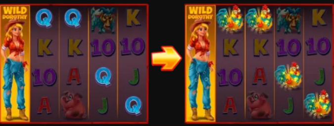 - คุณสมบัติพิเศษ Wild Dorothy เป็นสัญลักษณ์ 4 แถวที่ปรากฏเฉพาะบนรีลที่ 1 ในเกมหลักเท่านั้น สัญลักษณ์ Wild Dorothy จะใช้แทนสัญลักษณ์ทั้งหมดในชุดค่าผสมที่ชนะ ยกเว้นสัญลักษณ์โบนัส หากสัญลักษณ์ Wild Dorothy เพียงบางส่วนตกลงบนวงล้อที่ 1 มันจะเขยิบขึ้นหรือลงเพื่อครอบคลุมทั้งวงล้อ