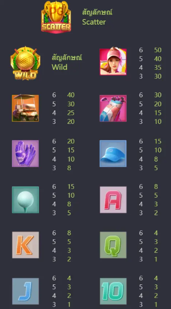 เท่าที่ฉันจำได้ เราไม่เคยเห็นสล็อตที่มีธีมกอล์ฟมาก่อน เราต้องยกความดีความชอบให้กับ ค่าย pg สำหรับความคิดสร้างสรรค์ของพวกเขา แม้ว่าธีมใหม่จะน่าสนใจ แต่คำถามใหญ่คือ… เราจะจ่ายเงินอย่างไร มาเริ่มกันที่สัญลักษณ์ก่อน สัญลักษณ์ที่มีมูลค่าสูงสุดในเกมคือ “นักกอล์ฟมืออาชีพสีชมพู” ซึ่งจะให้รางวัลเราด้วยเงินเดิมพัน 50 เท่าเมื่อเราหมุนสัญลักษณ์ 6 ตัว ขอเตือนคุณว่า 50 ครั้งนั้นไม่ใช่จำนวนเงินเพียงเล็กน้อยสำหรับเกมที่มีวิธีชนะเกือบ 50,000 วิธี ตามมาด้วยสัญลักษณ์ “รถกอล์ฟ” ที่จ่ายเงิน 40 เท่าของเงินเดิมพัน สัญลักษณ์ที่มีมูลค่าต่ำสุดคือไพ่ นี่คือสัญลักษณ์ทั้งหมดและอัตราการจ่ายเงินเมื่อเราหมุนสัญลักษณ์ 3, 4, 5 และ 6 ตัวตามลำดับ sca68-th