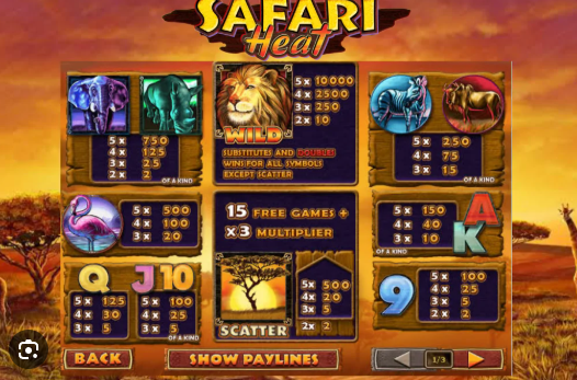 รูปแบบเกมเกมสล็อต SafariHeat ซาฟารีฮีท ที่ให้บริการในเว็บไซต์เกมสล็อต sca68-th เป็นวิดิโอสล็อตแบบ 5 รีล 3 แถว การชนะจะเรียงสัญลักษณ์จากซ้ายไปขวา เหมือนกันอย่างน้อย 3 ตัว สูงสุดถึง 5 ตัว ไลน์เดิมพันที่ชนะการเดิมพันในเกมนี้มี 15 ไลน์เดิมพัน เรียงจากซ้ายไปขวาเสมอ ต้องมีสัญลักษณ์เหมือนกันอย่างน้อย 3 ตัว สูงสุดถึง 5 ตัว การหมุน 1 ครั้งสามารถชนะได้มากกว่า 1 ไลน์เดิมพัน หากเกิดข้อผิดพลาดระหว่างเกมจะถือว่าเป็นโมฆะทั้งหมด และจะแสดงเงินรางวัลแบบเงินสดเท่านั้น