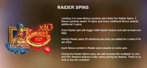 คุณสมบัติ Raider Spins สิ่งนี้จะเกิดขึ้นเมื่อสัญลักษณ์โบนัสเนเฟอร์ติติ 3 ตัวขึ้นไป บนวงล้อ คุณจะได้รับ 10 ฟรีสปินสำหรับ 3 สัญลักษณ์โบนัส และอีก 5 ให้สำหรับสัญลักษณ์โบนัสเพิ่มเติมแต่ละรายการ ระหว่างฟีเจอร์นี้ ช่องจ่ายเงิน 20 ช่องจะเพิ่มขึ้นเป็น 40 ช่อง ฟีเจอร์ Wild Raider ก็จะเข้ามามีบทบาทด้วย ที่มุมบนขวา คือ เคาน์เตอร์ Win Respins เมื่อใดก็ตามที่คุณชนะ สัญลักษณ์ที่ชนะจะหมุนใหม่โดยอัตโนมัติ ทำให้คุณมีโอกาสชนะอีกครั้ง ทุกครั้งที่ชนะ ตัวนับจะเพิ่มขึ้น โดยมีตัวคูณมากถึง 3 เท่า อย่างไรก็ตาม มันไม่มีขีดจำกัดระหว่าง Raider Spins ทางเข้าเล่น sca68-th