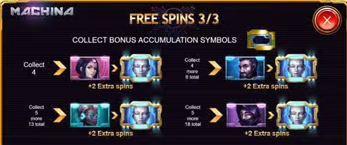 ในระหว่างการหมุนฟรี สัญลักษณ์การสะสมโบนัสจะถูกนับเป็นการกระจายและรวบรวมไปยังเคาน์เตอร์สะสมโบนัส เมื่อผู้เล่นสะสมสัญลักษณ์โบนัสสะสมตามจำนวนต่อไปนี้ เหตุการณ์จะเกิดขึ้นตามรายการด้านล่าง
