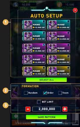 Auto play เป็นระบบที่ให้ผู้เล่นไม่ต้องเล่นเอง แต่ผู้เล่นจำเป็นต้องตั้งค่าการเล่นอัตโนมัติเท่านั้น การตั้งค่าที่ต้องตั้งค่าประกอบด้วย 3 ส่วนหลักคือ