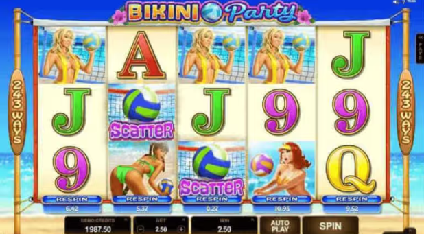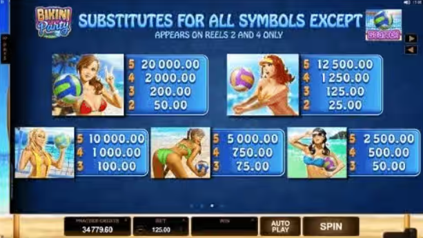 สัญลักษณ์ภายในเกม Bikini Party sca68-th สำหรับธีมของเกมจะเป็นบรรยากาศการเล่นวอลเล่ย์บอลบนชายหาดโดยมีสาว ๆ สวมบิกินี่และเล่นกีฬากลางแจ้งนี้ไปพร้อมกับคุณ เป็นปาร์ตี้ที่น่าสนใจทีเดียว ไปเล่นเกมสาวบิกินี่ชุดสีแดงมูลค่าสูงสุดคือ 400 ดอลลาร์บิกินี่สีส้มคือ 250 ดอลลาร์และอีก 3 สาวในชุดบิกินี่สีเหลืองสีเขียวและสีน้ำเงินมีมูลค่า 200, 100 และ 50 ตามลำดับ เพียงแค่หมุนตัวและพบกับสาว ๆ รับเงินรางวัลซึ่งอยู่ในระดับที่สูงพอสมควรแล้วคุณก็สามารถเล่นเกมสล็อตนี้ได้ ซึ่งขอบอกไว้ก่อนเลยว่าถึงแม้งานกราฟิกเกมนี้จะไม่ละเอียดมาก แต่แค่ดูสาว ๆ ที่พลิกไปมาสลับไปมาก็คุ้มกว่า ทดลองเล่นฟรี sca68-th