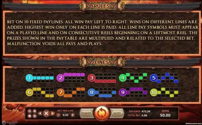 สำหรับเกมนี้มีไลน์เดิมพัน ด้วยกันทั้งหมด 10 ไลน์ ไม่สามารถปรับเพิ่ม หรือ ลดเส้นไลน์ได้ ทิศทางการชนะ จะนับจากซ้ายไปขวา และ จะต้องได้สัญลักษณ์ เหมือนกัน 3 ช่องขึ้นไป โดยมากที่สุดคือ 5 ช่อง จึงจะเรียกว่าชนะ มีการคิดอัตราการจ่ายรางวัล ตามมูลค่าของสัญลักษณ์นั้น ๆ ผู้เล่นสามารถเลือก การวางเดิมพันได้ตามที่ต้องการ การคำนวณลักษณะ lines เส้นนั้นก็จะแตกต่างกันออกไป