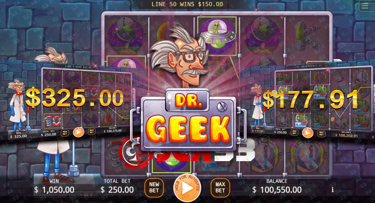 - คุณสมบัติเกมโบนัส: เกมโบนัส Dr. Geek จะถูกเปิดใช้งานเมื่อผู้เล่นเก็บพลังงานเพียงพอสำหรับการเปิดใช้งาน การเก็บพลังงานจะต้องเก็บจากการเดิมพันในเกมโบนัสเท่านั้น หลังจากเก็บพลังงานครบแล้วผู้เล่นสามารถเข้าสู่โบนัส Dr. Geek เพื่อชนะเงินรางวัลที่มีค่าสูงกว่า
