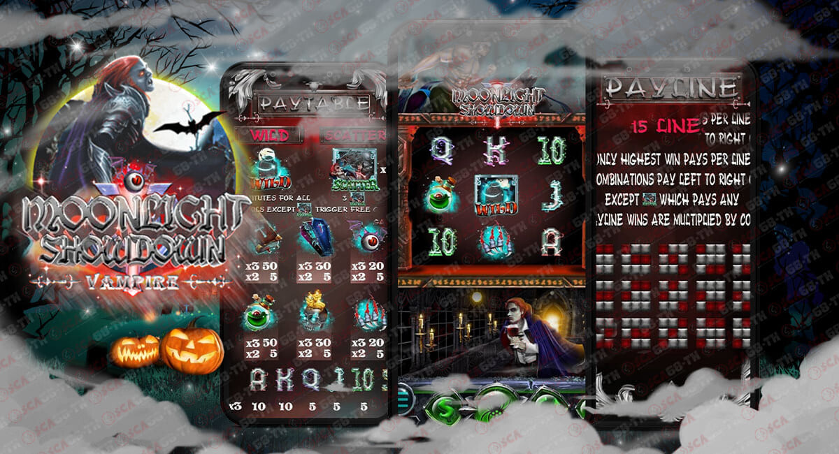 Moonlight Showdown-Vampire เป็นเกมสล็อตออนไลน์ที่มีแนวคิดเกี่ยวกับนักล่าแวมไพร์ โดยจะมีตัวละครผู้เล่นเป็นแวมไพร์ที่ต้องล่าคู่แข่งของเขาที่เป็นมนุษย์หรือแวมไพร์ตัวอื่นๆ เพื่อเป็นตัวเลือกในการชนะรางวัลที่มีมูลค่าสูง โดยเกมนี้มีฟีเจอร์ที่น่าสนใจอย่างมาก เช่น การหมุนวงล้อในเกมฟรีสปิน และโอกาสที่จะเป็นเจ้าของเงินรางวัลโบนัสที่มีมูลค่าสูงกว่าเดิมพันที่เราใช้ในการเล่นเกมนี้
